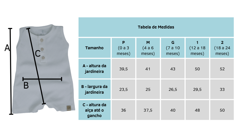 Atenção: A tabela de medidas é feita sob uma média, cada bebê tem suas particularidades de peso e tamanho que não devem ser ignoradas ha hora da escolha do tamanho da roupinha. Aconselhamos usar uma peça usal do bebê para comparação das medidas de acordo com nossa tabela.